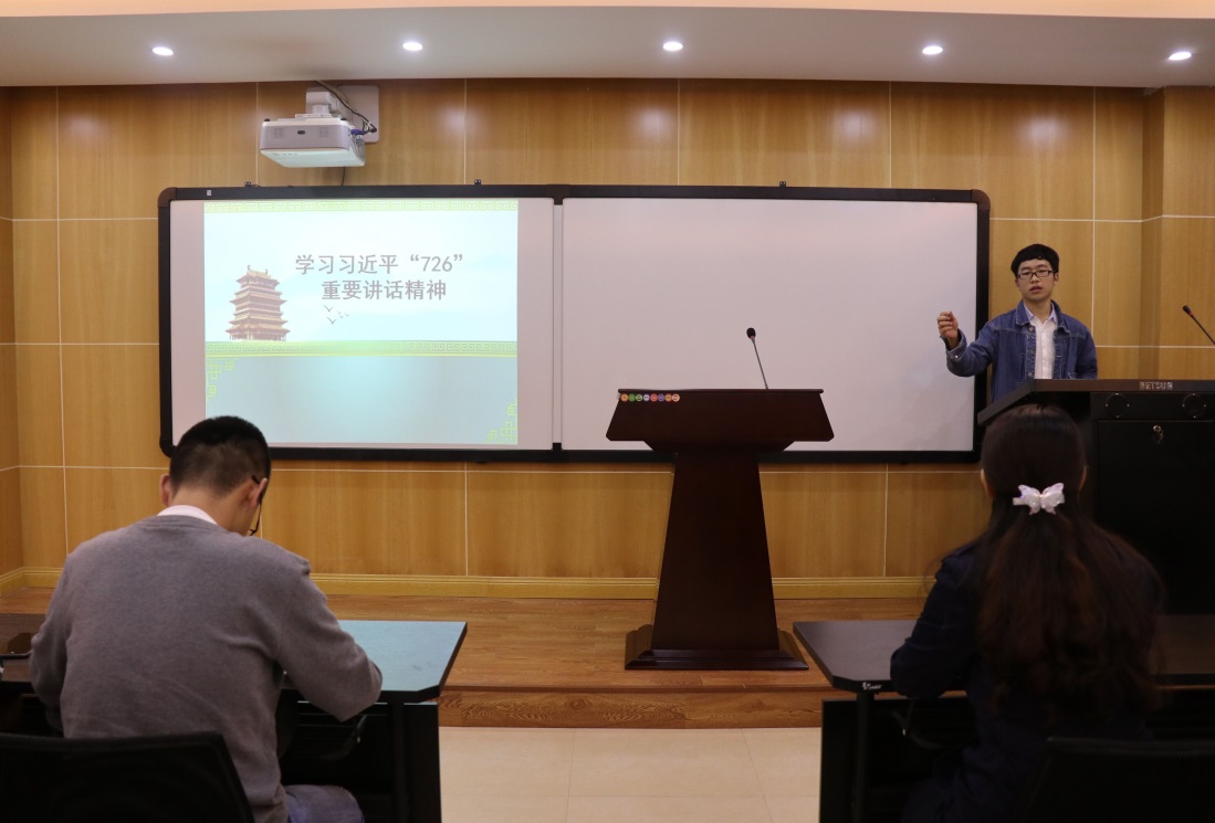 张林同学代表第一小组,以“学习习近平‘7.26’重要讲话精神”为主题,汇报了“坚定不移把中国特色社会主义事业推向前进”、“从历史性变革中把握大势”、“牢牢把握我国发展的阶段性特征”、“勇于推进实践基础上的理论创新”、“为实现“两个一百年”奋斗目标而努力”和“把党建设得更加坚强有力”这六个部分内容,将十九大报告内容与“7.26”重要讲话内容相结合进行分析理解,并表达了自己对于党和国家的自豪与自信。