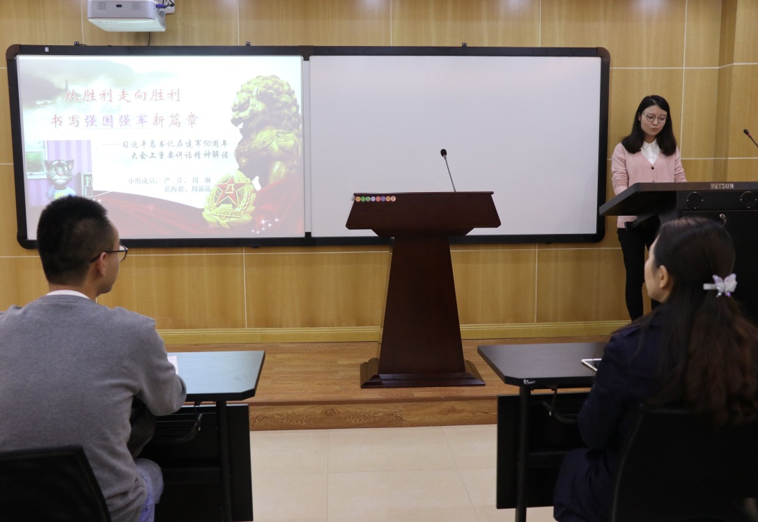 周琳同学代表第二小组,以“从胜利走向胜利,书写强国强军新篇章——习近平总书记在建军90周年大会上的重要讲话精神解读”为主题,向同学们汇报了习总书记在建军90周年大会上重要讲话的综述、习总书记在建军90周年大会上的讲话精神和习总书记在建军90周年大会上的讲话释放的五大信息。周琳向大家展示了中国人民军队的强大力量和伟大精神,表达了对于人民军队的崇高敬意。