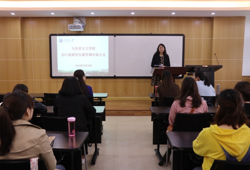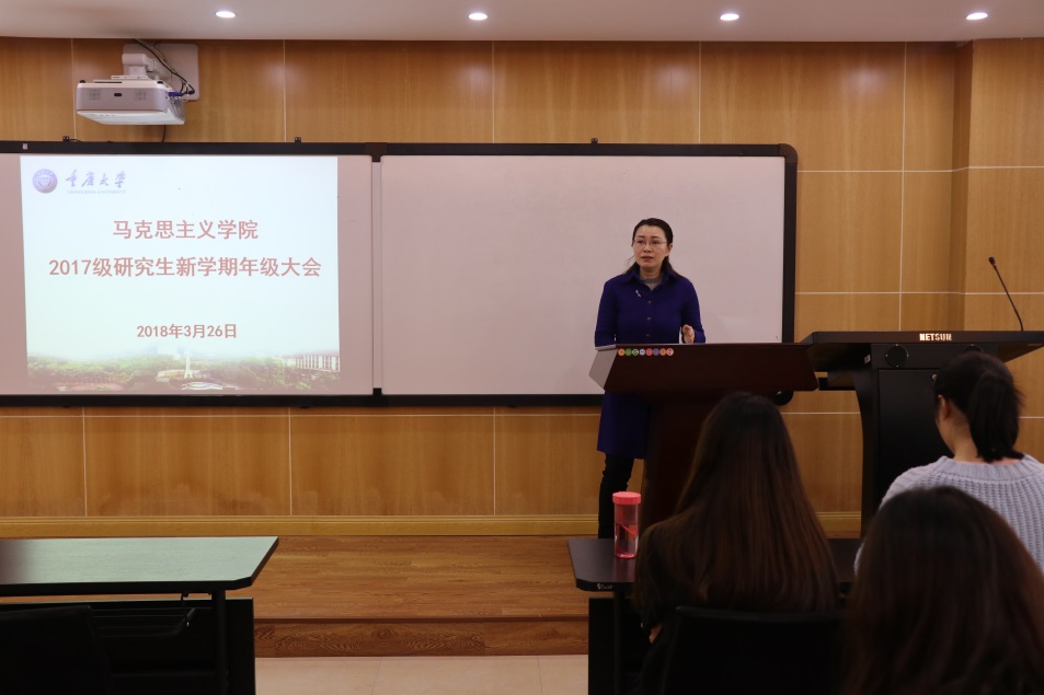 王玉琴老师首先总结了上学期的学生工作,希望在同学们在新学期要进一步加强学习、工作的主动性。她说,“主动学习是你们的职责,有困难主动找老师是你们的选择,学院时刻关注大家的一切,因为你们是马院的孩子。”她要求大家要学会总结、学会规划,明白自己要成为什么的人、怎样成为理想状态的人。此外,王老师希望学生在学习之余也要加强锻炼,“我们要求同学们不仅学习优秀,身心也必须是健康的。”王老师还对同学们日常的安全问题进行了强调。