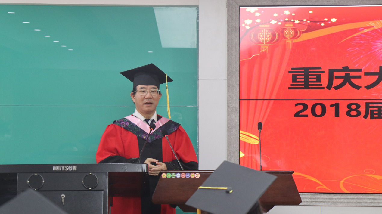 在学院党委书记罗滌宣读授位决定后,典礼正式拉开序幕。肖铁岩院长代表学院向圆满完成学业的2018届毕业研究生表示真诚的祝贺,向多年来为同学们的成长辛勤付出的老师和家长们表示衷心的感谢!他结合自己的亲身经历,感慨成长有烦恼,长大不容易。作为大朋友,作为过来人,他送给毕业生们三句话:一是坚定理想信念;二是坚持努力学习;三是坚韧不拔地奋斗。他说道:“只要你们能做到这‘三坚’,你们的未来将灿若满天星斗!”