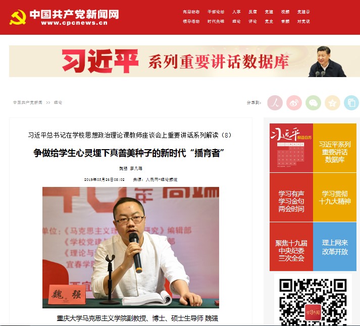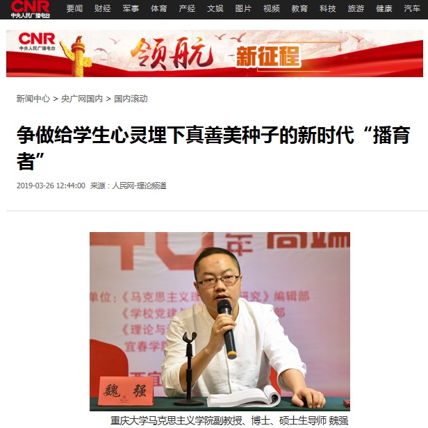 魏强副教授、硕士生廖凡瑶合著的学习解读习近平总书记在学校思想政治理论课教师座谈会上发表的重要讲话的文章《争做给学生心灵埋下真善美种子的新时代“播育者”》入选人民网( ),并被中国新闻网()、中国网()、央广网()等多家权威主流媒体转载。