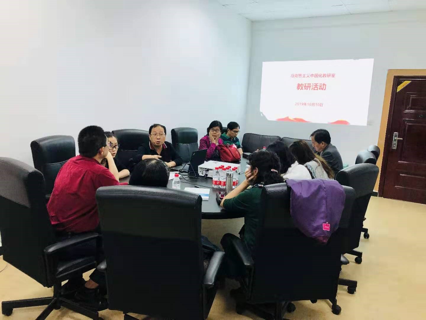 马克思主义中国化教研室继续坚持每两周一次教研活动和集体备课制度。为了保证在线课程的录制高质量完成,教研室分别于2019年9月5日、10月10日在学院402B开展《毛泽东思想和中国特色社会主义理论体系概论》在线课程建设研讨会。