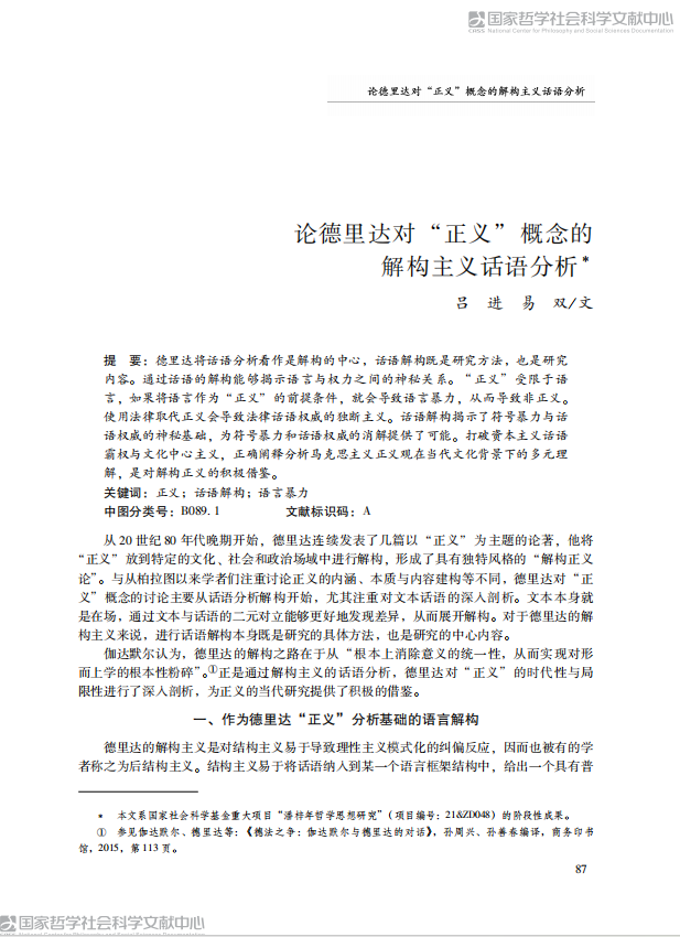 德里达将话语分析看作是解构的中心, 话语解构既是研究方法, 也是研究 内容。 通过话语的解构能够揭示语言与权力之间的神秘关系。 “正义” 受限于语 言, 如果将语言作为 “正义” 的前提条件, 就会导致语言暴力, 从而导致非正义。 使用法律取代正义会导致法律话语权威的独断主义。 话语解构揭示了符号暴力与话 语权威的神秘基础, 为符号暴力和话语权威的消解提供了可能。 打破资本主义话语 霸权与文化中心主义, 正确阐释分析马克思主义正义观在当代文化背景下的多元理 解, 是对解构正义的积极借鉴。