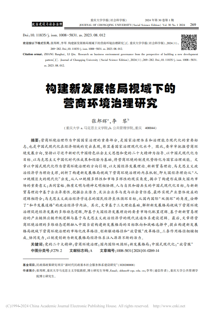 营商环境治理作为中国国家治理的重要部分,是国家治理体系和治理能力现代化的重要标志,也是中国式现代化在经济领域的突出表现,彰显着国家治理现代化水平。因此,要牢牢把握营商环境发展方向,坚持以习近平新时代中国特色社会主义思想和党的二十大精神为指导、以中国式现代化为目标、以马克思主义中国化时代性成果和经验为基础,将营商环境的制度优势转化为国家治理效能。文章以中国式现代化作为营商环境治理的方向引领,以大国经济发展理论、新新贸易理论、马克思主义政治经济学为理论支撑,剖析了构建新发展格局视域下营商环境治理的内在机制,即大国经济理论从“人口规模巨大的现代化”出发,从人口规模多样性和市场多样性的现实角度,揭示了构建形成强大国内市场的重要意义;共同富裕、物质文明与精神文明相协调、人与自然和谐共生的中国式现代化目标,与新新贸易理论中基于企业异质性、挖掘企业潜力、关注企业参与度与社会责任感、最终实现产业整体效益的逻辑相符合;马克思主义政治经济学追求的国民经济良性循环目标,从国内国际“双循环”的角度,诠释了“和平发展道路”的政治经济学内涵。其次,文章基于三大理论基础,解析新发展格局视域下营商环境治理促进经济发展的多维动态逻辑,即基于大国经济发展理论的要素市场化配置逻辑、基于新新贸易理论的产业链供应链升级逻辑与基于马克思主义政治经济学的现代流通体系建设逻辑。最后,文章将营商环境治理的多维动态逻辑融入中国当前构建新发展格局的目标取向和战略选择中,提出构建新发展格局视域下营商环境治理的市场化改革路径、创新驱动路径和“放管服”改革路径,三条作用路径相辅相成、协同发力,以制度创新为新发展格局经济体系注入源源不断的活力。