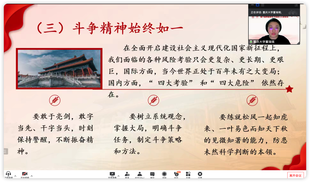 董瑞祺作了题为《从“两个务必”到“三个务必”的继承与发展——深刻领会“三个务必”提出的背景及指导意义》的发言。她详细阐述了“两个务必”与“三个务必”的提出背景,诠释了党的初心使命、优良作风及斗争精神,强调了“三个务必”与“两个务必”是一脉相承又与时俱进的关系。
