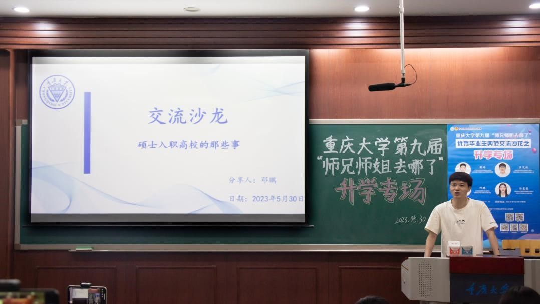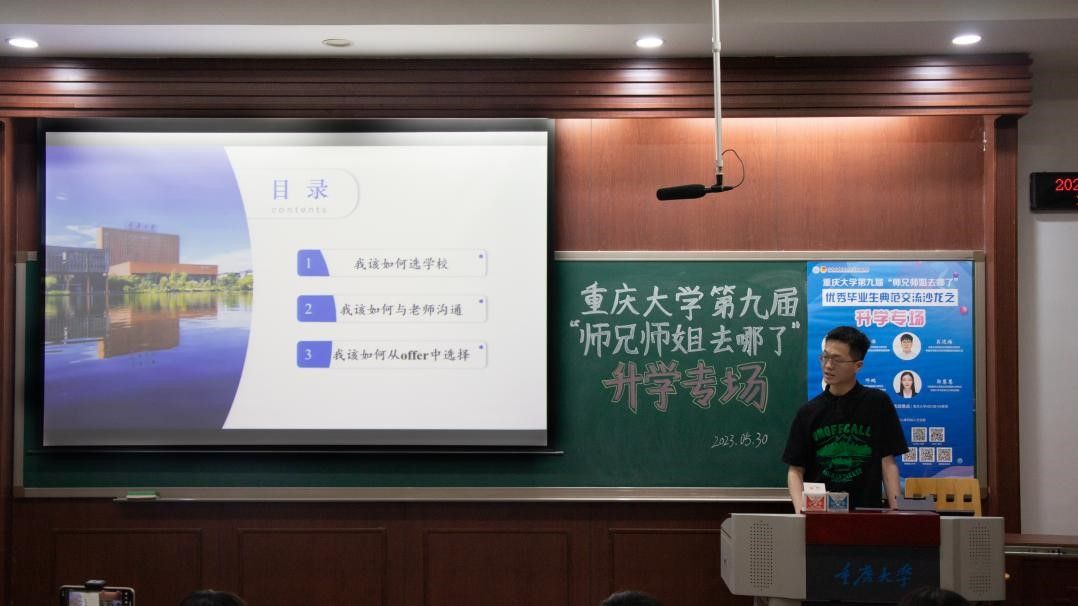 、光电工程学院、法学院、公共管理学院的郭慧慧、吴道福、邓鹏、彭洋4名优秀毕业研究生作经验分享,他们从升学规划、申博准备、申博过程、心理调节等多方面分享了自己在升学过程中面临的困难以及如何解决并取得心仪的offer。