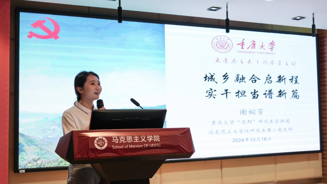 研究生第二党支部党员谢婉芳在活动中作了题为“城乡融合启新程,实干担当谱新篇”的主题宣讲。谢婉芳以党的二十届三中全会精神为核心,首先深入解读了《决定》中“城乡融合发展”政策的重大意义、显著特色以及体制机制的要求,阐明了“城乡融合发展”对于推进中国式现代化的关键性作用。随后,她又结合色戒