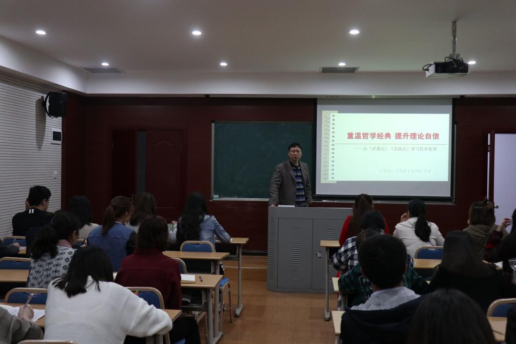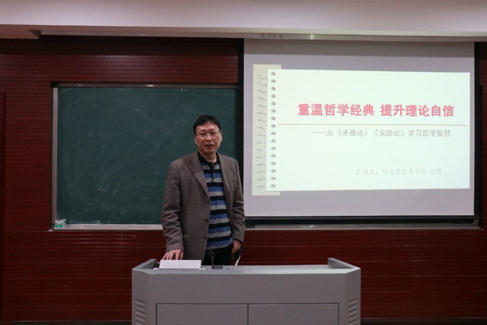 吕进老师从刚召开的十九大出发,以《实践论》和《矛盾论》中的哲学思维为依托,以“重温哲学经典、提升理论自信”为主题,分别从《实践论》和《矛盾论》的历史创作背景、核心思想、理论意义及现实价值四个方面阐述了我们为什么要重温哲学经典以及如何提升理论自信。