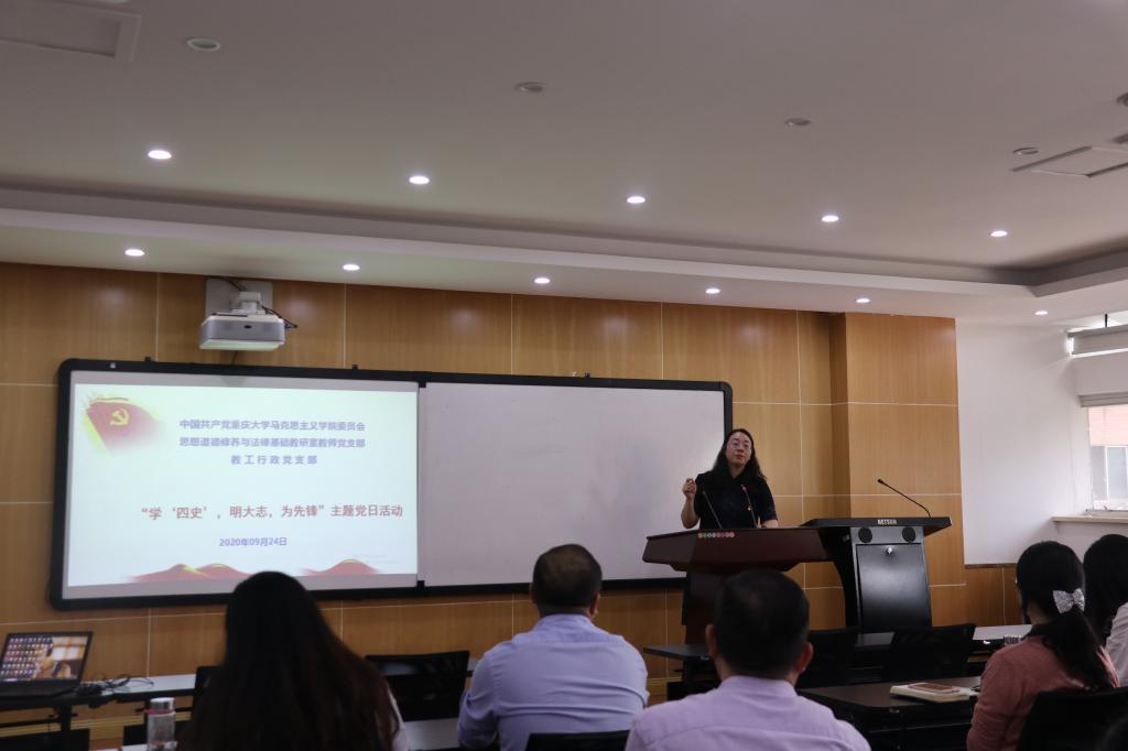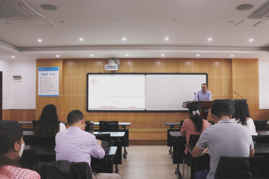 2020年9月24日上午,思想道德修养与法律基础教研室教师党支部和教工行政党支部联合开展学习“学‘四史’,明大志,为先锋”主题党日活动,活动在学院412教室进行,学院党委书记罗滌参加活动,活动由思想道德修养与法律基础教研室党支部书记魏强主持,思想道德修养与法律基础教研室陈迅副教授作专题讲座。