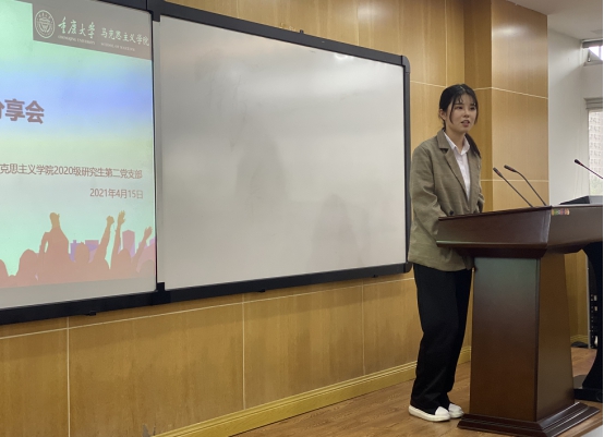 周作玉同学就重庆谈判这段历史进行了分享:“回顾重庆谈判这段历史,认清中国共产党谋求和平的真诚愿望,也深刻感受到革命领袖敢于斗争、善于斗争的大智大勇。今年恰逢建党100周年,百年风雨,百年辉煌,从“小小红船”到”“巍巍巨轮”,我们党创造了非凡业绩,书写了中华民族发展进程中光辉灿烂的篇章。作为党员,我们应该树立正确的党史观,旗帜鲜明地反对历史虚无主义,正确认识党史上的重大事件、重要会议、重要人物。作为 色戒