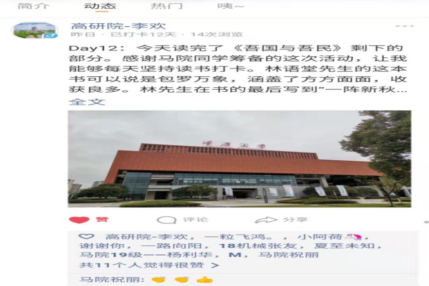 9月28日至10月9日,书友们进行线上“十二天打卡计划”活动。报名读书的同学在推荐书目中择取感兴趣的书籍,通过微信小程序——“小打卡”组成阅读圈,留言、评论并分享读书感悟。