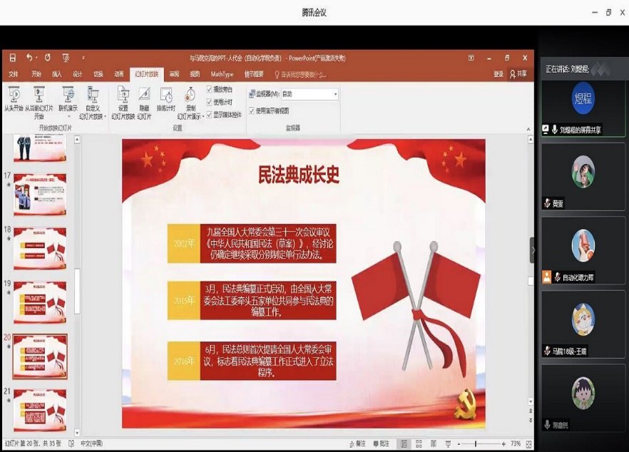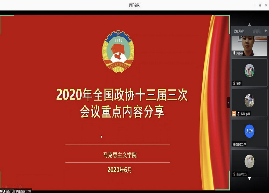 接着,自动化学院的刘煜程同学向大家介绍了第十三届全国人民代表大会第三次会议的重要内容。他从人民代表大会常务委员会审议政府工作报告、《中华人民共和国民法典(草案)》的议案、《全国人民代表大会关于建立健全香港特别行政区维护国家安全的法律制度和执行机制的决定(草案)》的议案等几个方面进行分享和解读。