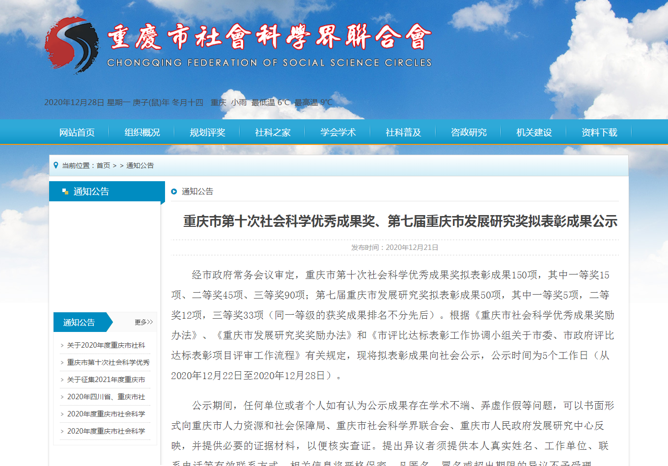2020年12月21日,重庆市第十次社会科学优秀成果奖、第七届重庆市发展研究奖拟表彰成果公示,色戒 刘洪彪、杜俊华、庞永红、吕进、蒲清平五位老师获奖。获奖信息如下: