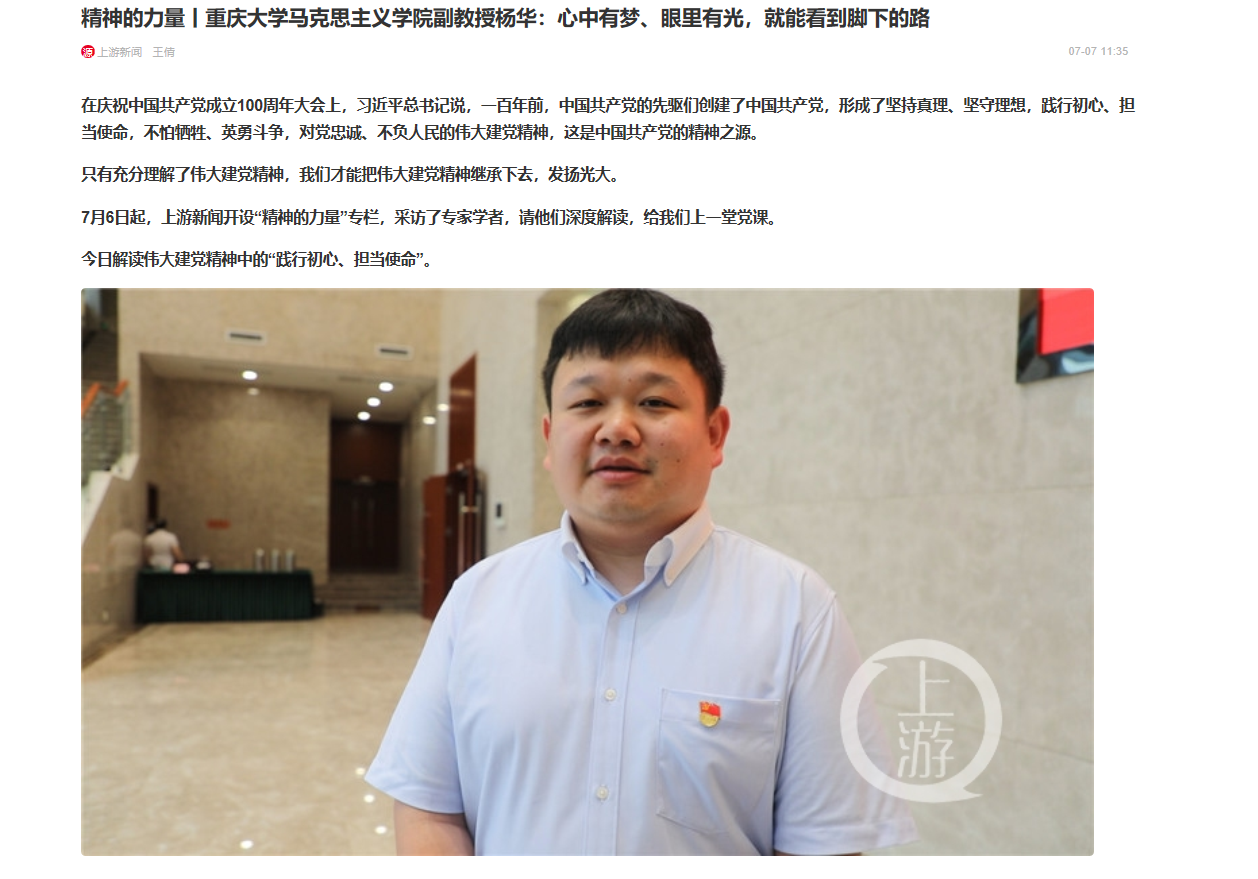 7月7日, 色戒 杨华副教授接受上游新闻“精神的力量”专栏采访,解读中国共产党伟大建党精神中的“践行初心、担当使命”。