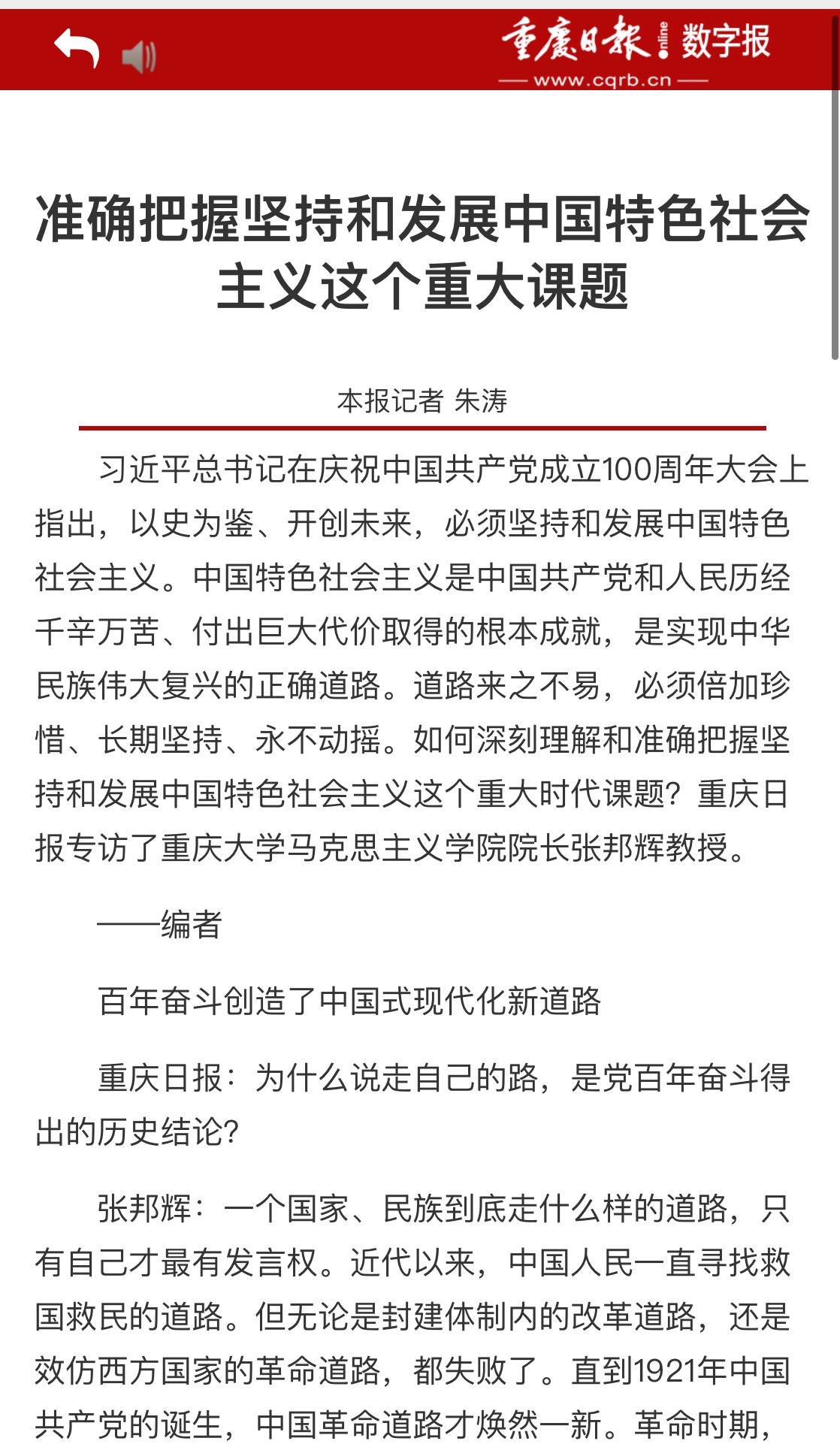 在采访中,张邦辉回答了“为什么说走自己的路,是党百年奋斗得出的历史结论?”“怎样理解我们坚持和发展中国特色社会主义,创造了中国式现代化新道路?”“坚持和发展中国特色社会主义对世界发展有哪些贡献和意义?”“新的征程上,该如何把中国发展进步的命运牢牢掌握在自己手中,继续走好自己的路?”等问题。