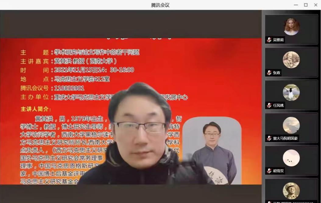 举行第二十七讲“红岩讲坛”活动,西南大学黄其洪教授以“学术研究与论文写作中的若干问题”为主题作了学术讲座。本次讲座采用线上腾讯会议、线下课堂讲座的方式同步进行,讲座由 色戒