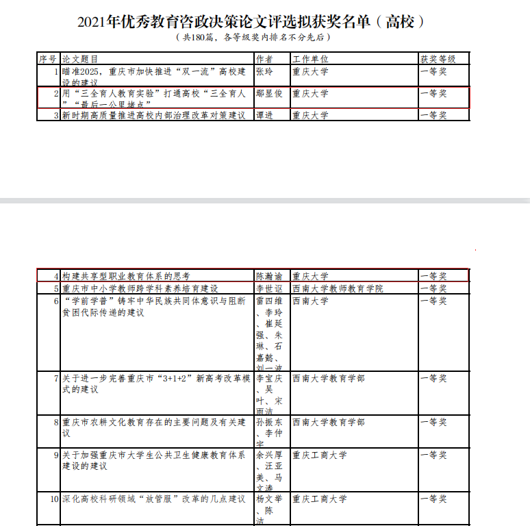 近日,重庆市教育委员会公布了2021年教育咨政决策论文获奖名单, 色戒 鄢显俊教授撰写的《用“三全育人教育实验”打通高校“三全育人 ”“最后一公里堵点”》一文,青年教师陈瀚谕撰写的《构建共享型职业教育体系的思考》一文荣获一等奖,魏强副教授撰写的《高校教学科研岗青年教师成长面临的三大矛盾及对策建议》荣获三等奖。