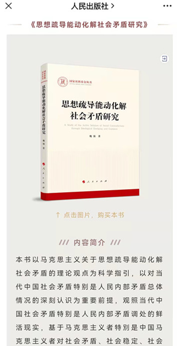 2021年11月21日,人民出版社官方微信平台推出精选图书,马克思主义理论学科重庆市学术技术带头人(后备人选)魏强副教授主持的以良好等级结项的国家社科基金项目同名专著《思想疏导能动化解社会矛盾研究》成为同《习近平法治思想学习纲要》《<中共中央关于党的百年奋斗重大成就和历史经验的决议>辅导读本》一同推发的精选图书之一,受到社会广泛关注。