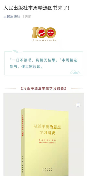 据悉,人民出版社始建于1921年9月1日,重建于1950年12月1日,是党和国家政治读物出版社,也是我国第一家著名的哲学社会科学综合性出版社。毛泽东同志亲笔题写的“人民出版社”社名,成为国家和各省级人民出版社最为显著的形象标志。2021年10月,习近平总书记还致信祝贺人民出版社成立100周年。