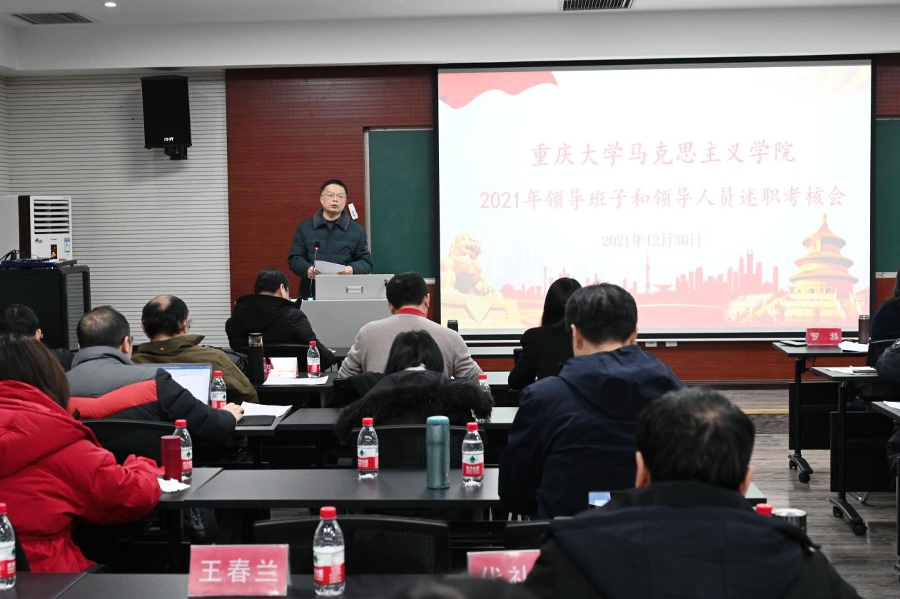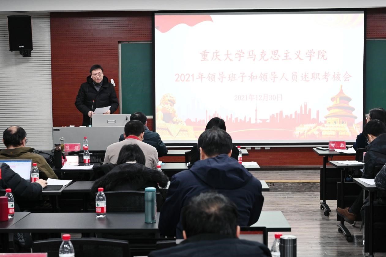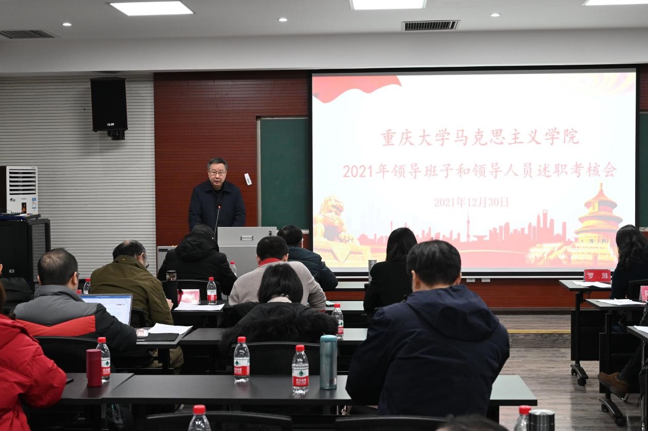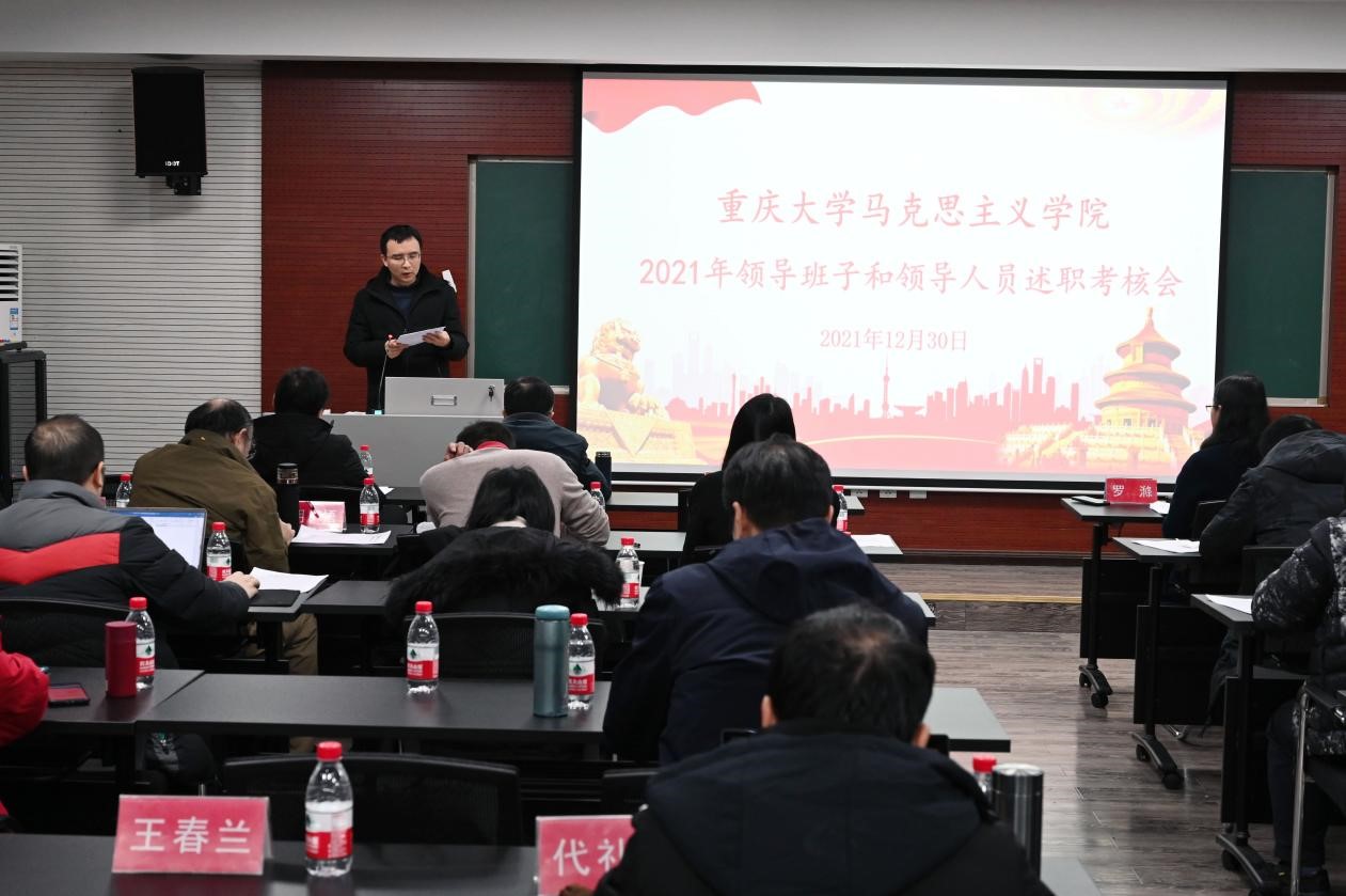 于学院406教室举行2021年领导班子和领导人员述职考核会,党委宣传部副部长徐方正、党委组织部组织工作室副主任杨乾龙、 色戒