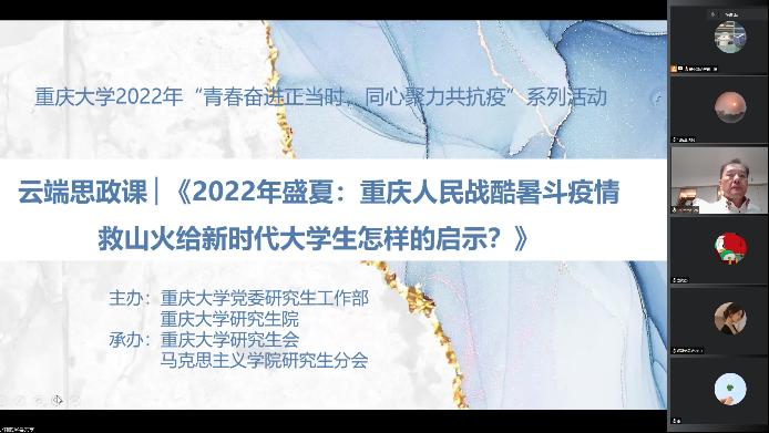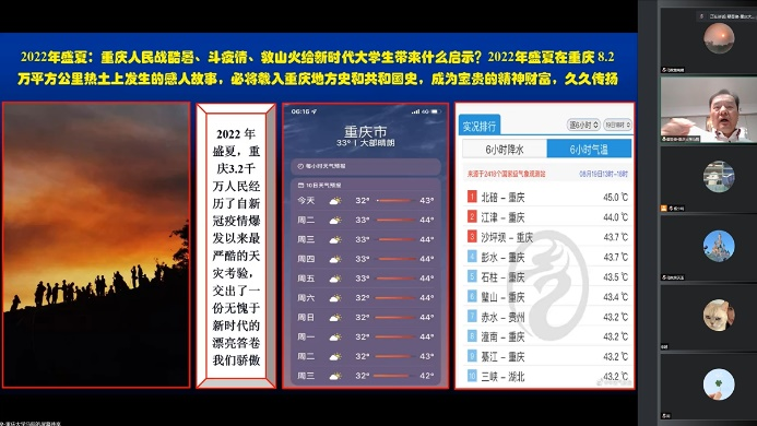 鄢显俊教授为马院师生上了一堂题为《2022年盛夏:重庆人民战酷暑斗疫情救山火给新时代大学生怎样的启示?》的云端思政课。课堂由 色戒