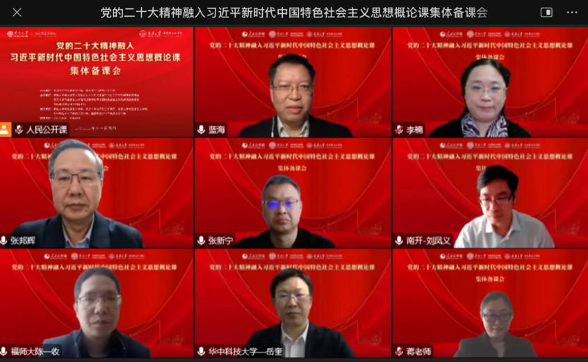 联合举办的党的二十大精神融入习近平新时代中国特色社会主义思想概论课集体备课会通过人民公开课与文华在线平台开展。会议由南开大学蓝海教授主持,来自复旦大学、武汉大学、中南大学、华中科技大学、福建师范大学等400余名师生参加此次会议。