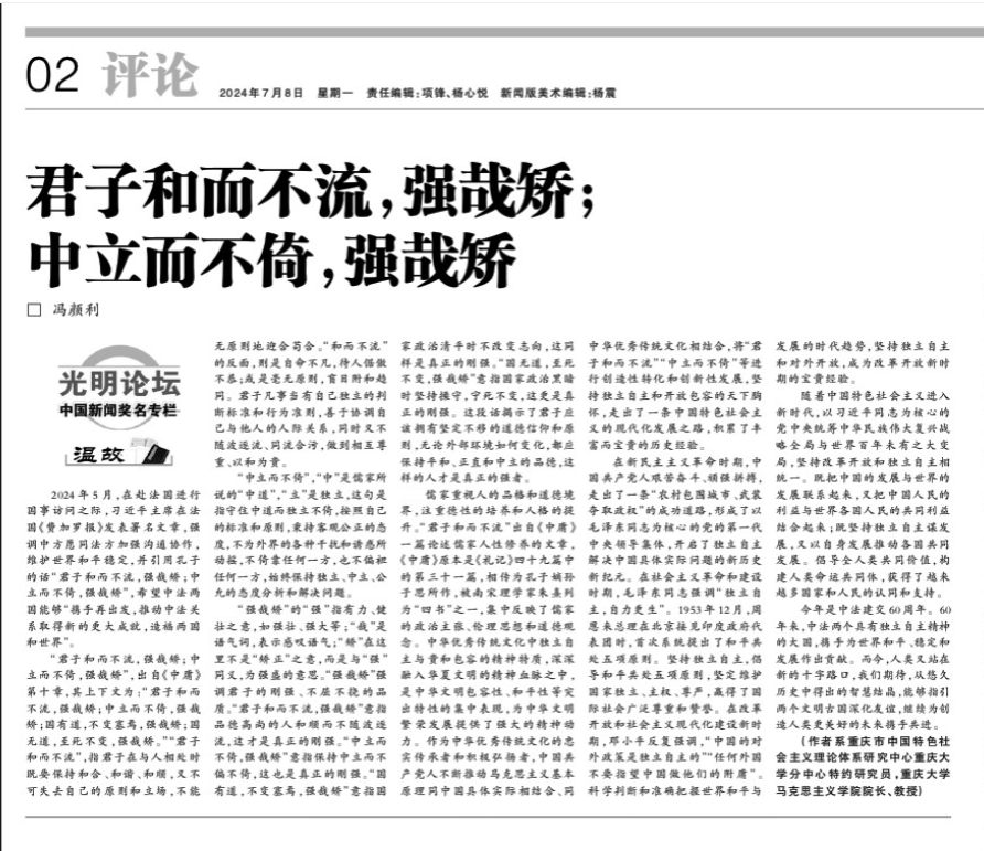 2024年7月8日,《光明日报》刊发了马院院长冯颜利教授的署名文章《君子和而不流,强哉矫;中立而不倚,强哉矫》。这是马院院长冯颜利教授今年以重庆市中特中心重大分中心名义发表的第3篇“ 三报一刊”理论文章。