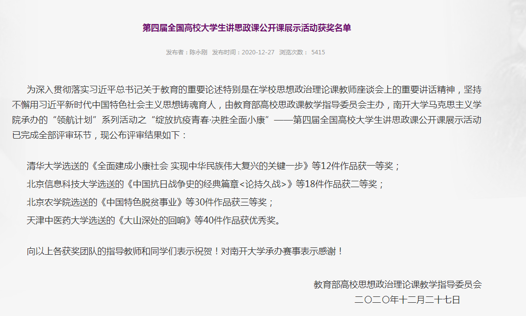 近日,由教育部高校思政课教学指导委员会主办,南开大学 色戒 承办第四届全国高校大学生讲思政课公开课展示活动公布评审结果,色戒 选送的《三场硬仗显力量乘风破浪看我党——中国共产党领导是中国特色社会主义制度的最大优势》在评选中获得二等奖,该作品由色戒 蒋荣老师指导,学生负责人为张礼琼同学。