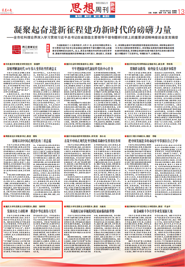 《重庆日报》思想周刊发专版,摘登9月21日召开的全市社科理论界深入学习贯彻习近平总书记在省部级主要领导干部专题研讨班上的重要讲话精神座谈会有关专家主要发言观点,张邦辉院长表示:在新时代新征程上,我们要发扬历史主动精神,乘势而上、砥砺前行,调动广大人民群众的积极性,不断开创中华民族伟大复兴的新局面,取得中华民族伟大复兴的新胜利,迎来中华民族伟大复兴的新的历史之变。