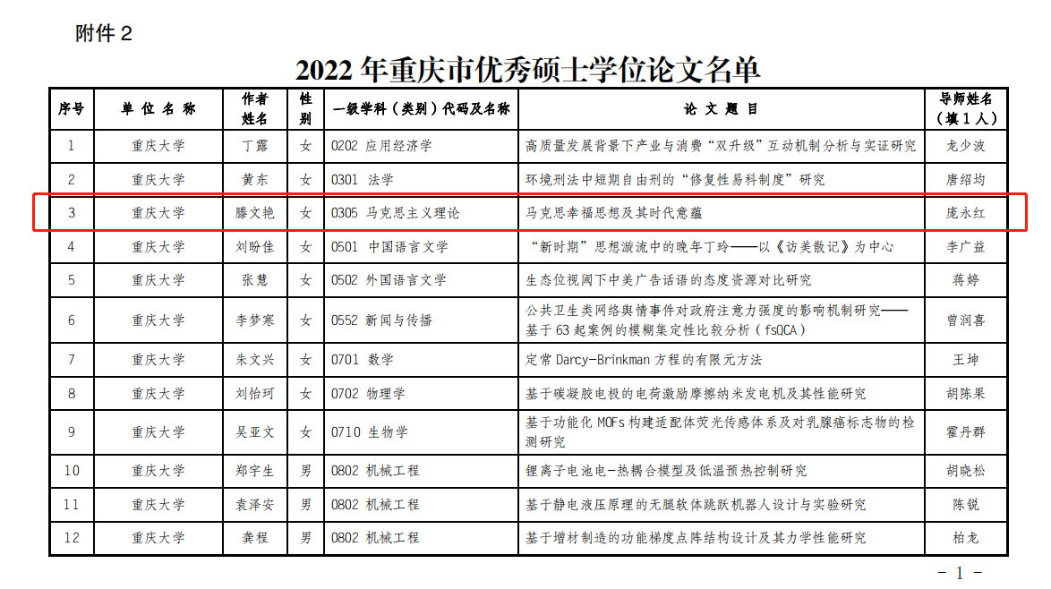 近日,重庆市教育委员会公布了2022年重庆市优秀硕士学位论文评选结果,色戒 庞永红教授所指导的硕士研究生滕文艳的毕业论文获评重庆市优秀硕士学位论文。