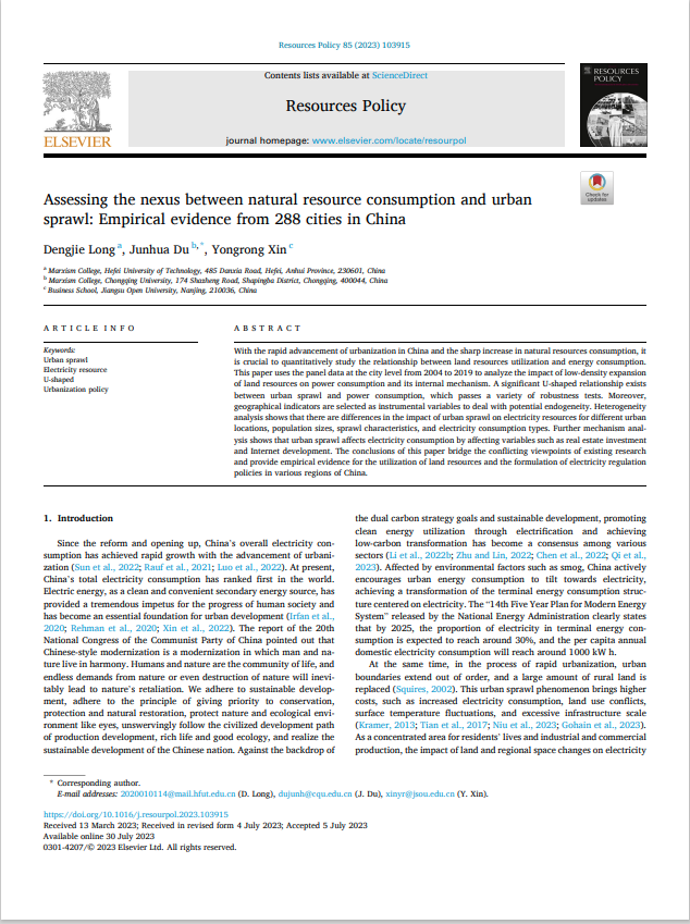 杜俊华教授(通讯作者)阐释能源资源的英语论文《Assessing the nexus between natural resource consumption and urban sprawl 》,发表在SSCI一区外文期刊《RESOURCE POLICY》2023年第8期上。该期刊也是JCR一区论文,影响因子5.634。该文认为,城市扩张与电力消耗之间存在显著的 U 型关系;不同的城市地理位置、人口规模、城市扩张特征以及不同的电力消费类型,使城市扩张对电力资源的影响存在差异。这为中国的土地资源利用和电力监管政策的制定提供了一定的经验。
