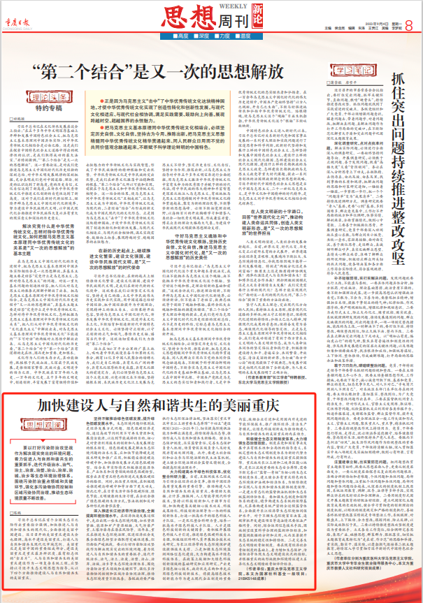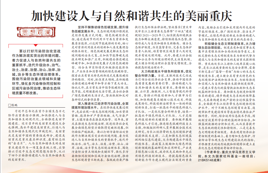 陈鹏博士在《重庆日报》思想周刊栏目发表《加快建设人与自然和谐共生的美丽重庆》一文。