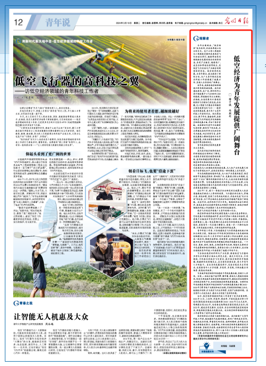 低空经济是让青春飞扬的理想之地。我们盼望广大青年科技工作者,能把握时代发展的潮流,面对广阔的成长空间、优越的成长环境,带着坚定的信念、钻研的精神,在科技攻关路上持续奋发努力、追逐梦想,不断为低空经济发展探索更多有益经验、贡献更多成果;也盼望有更多有志青年加入低空经济相关科技领域的队伍,将个人奋斗的小目标融入国家发展的大蓝图,在科技创新之路上不断成长!