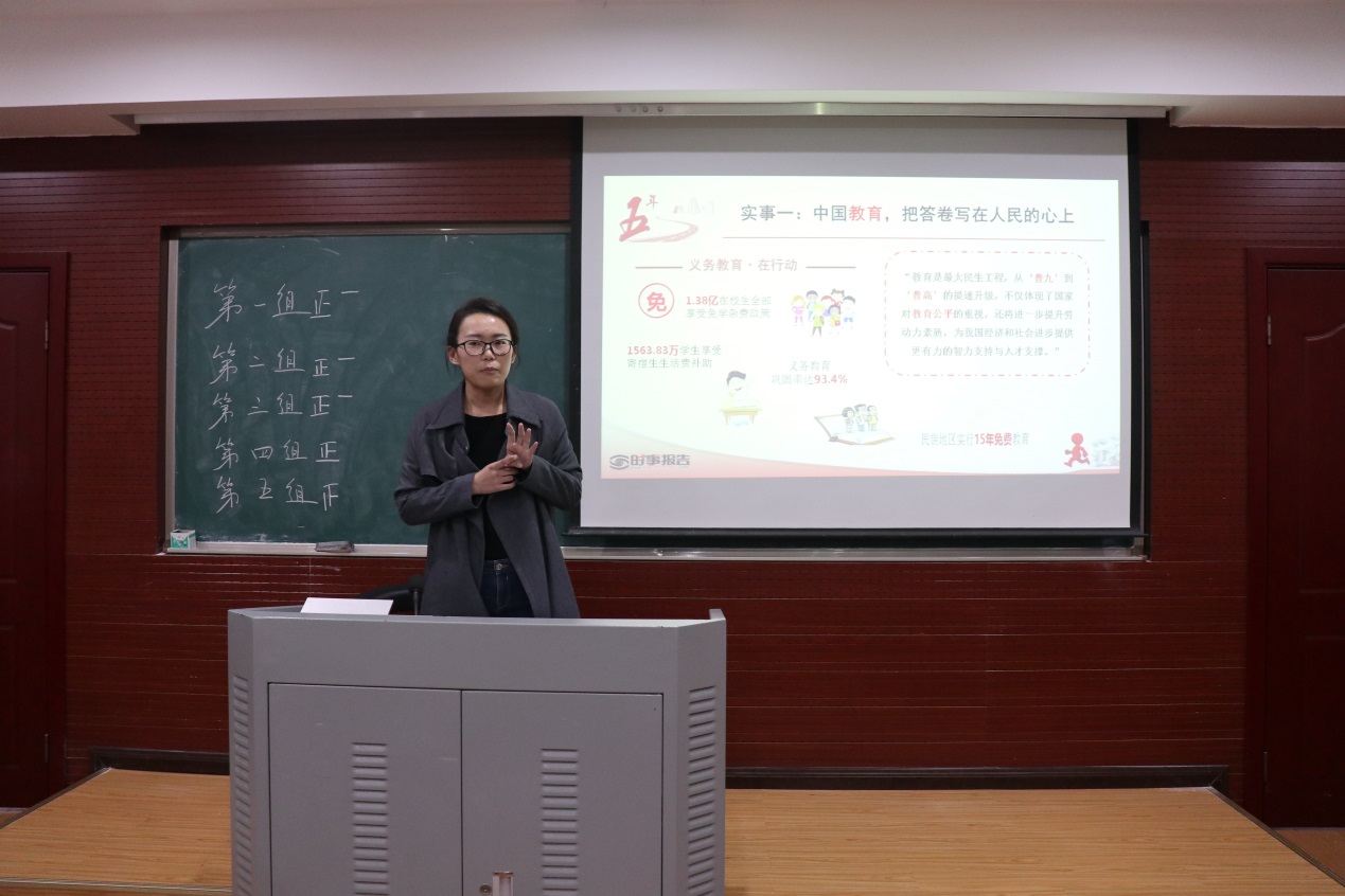 经过热烈的组内讨论后,政治组代表谭力,经济组代表蒋艺、文化代表组张林、民生代表组杨蕾、生态组代表江尧分别就本组负责内容为大家作分享。他们用一张张图片、一组组数据、一件件案例为大家展现了十八大以来的辉煌成就。在座的同学纷纷表示,很荣幸自己是一名中国人!
