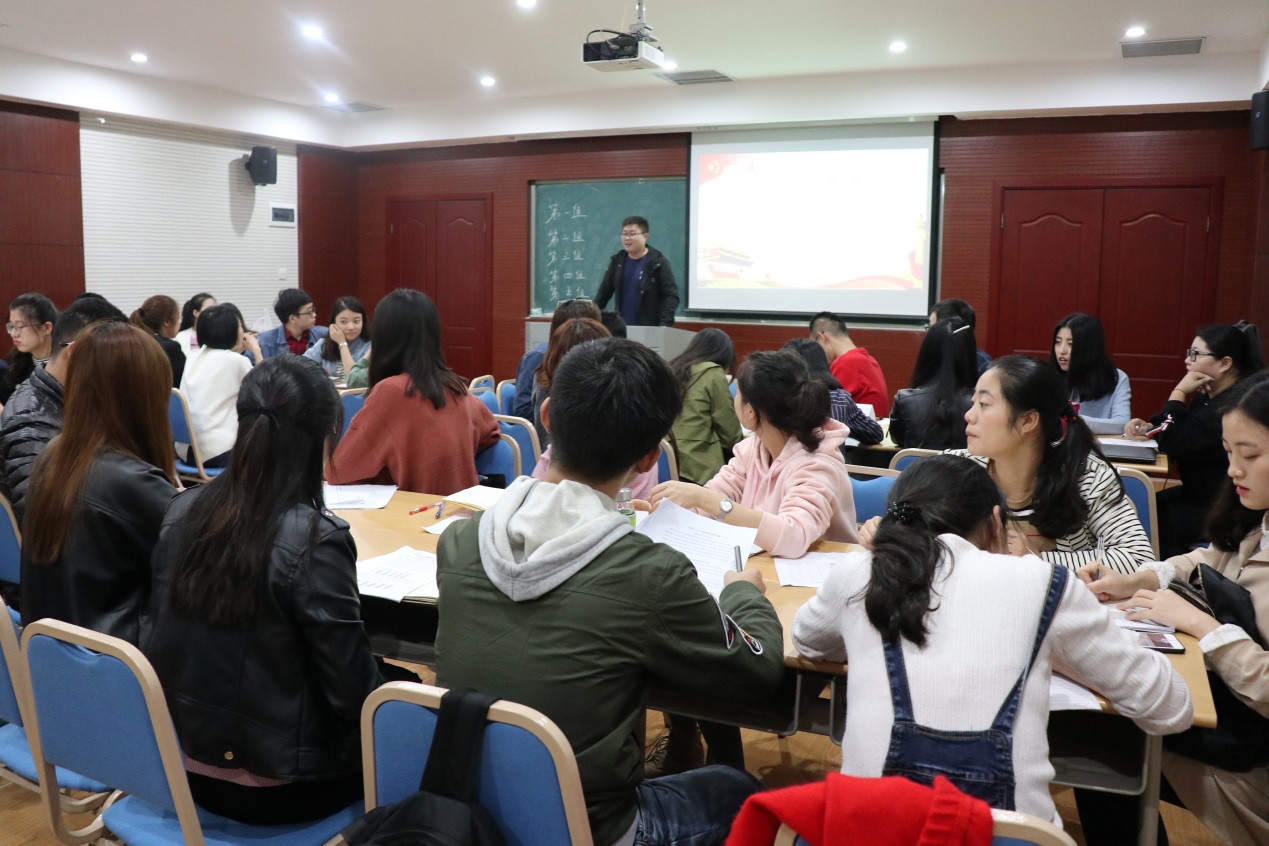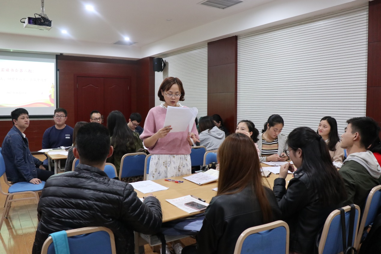 研团委学生会学术部部长马尚明首先介绍了活动主题和活动流程。读书会以小组讨论形式进行,主要分为组内讨论、代表总结并提问、组间交流等环节。此次读书会将同学分为五组,分别负责讨论十八来以来我国在政治、经济、文化、民生、生态五大方面取得喜人成绩。